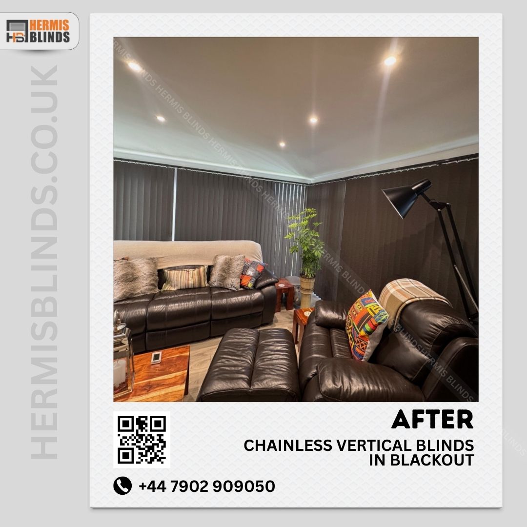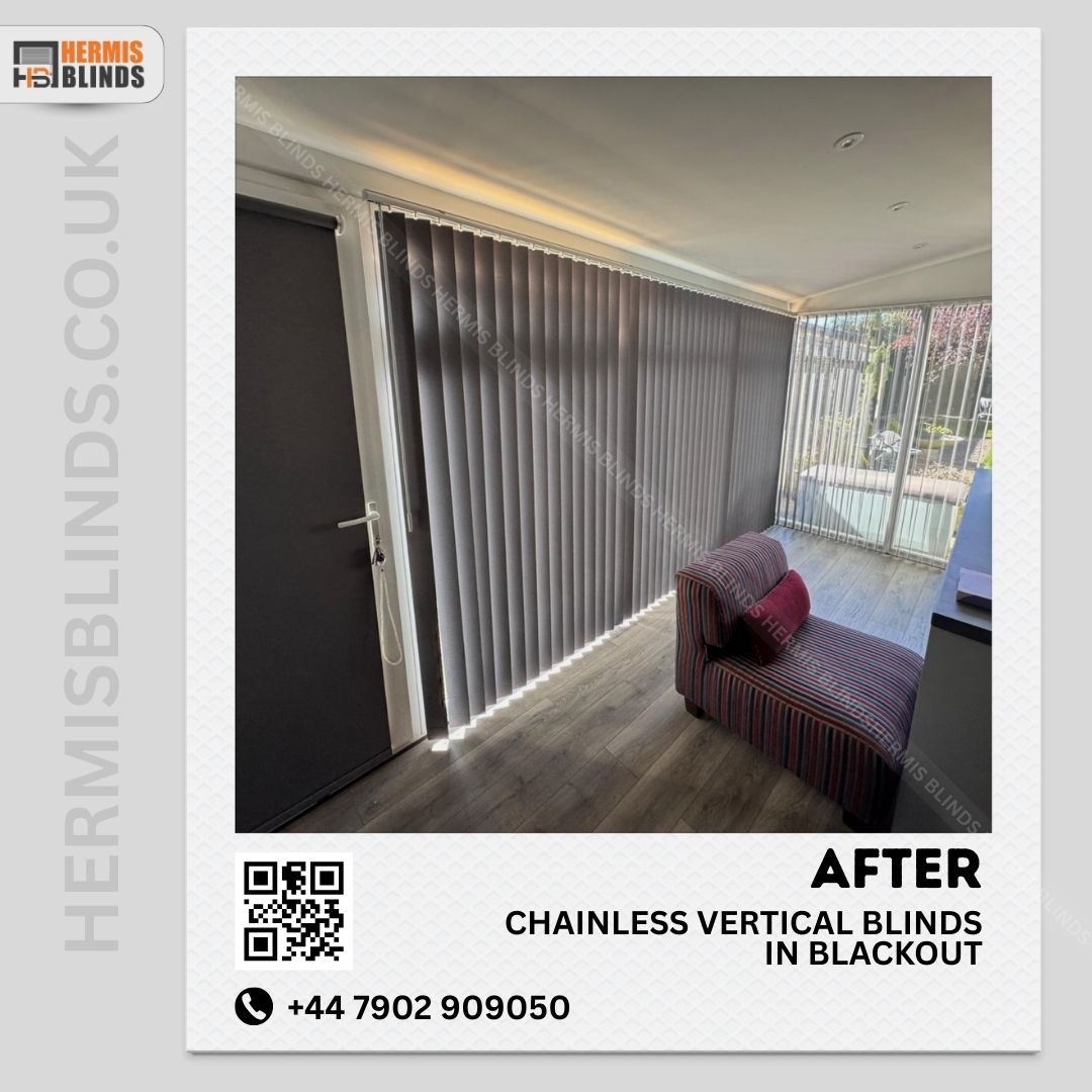 Chainless Vertical Blinds in Blackout with matching colour combo